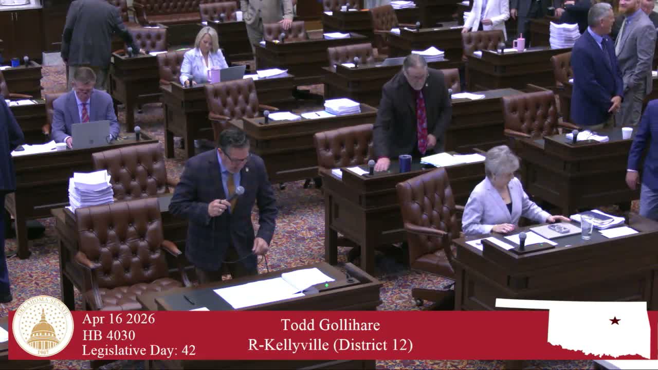 The Oklahoma Senate moved a large block of joint committee reports and third‑reading measures on April 16, approving appropriations and policy bills across education, transportation, health, and administration, alongside several high‑profile policy votes.
