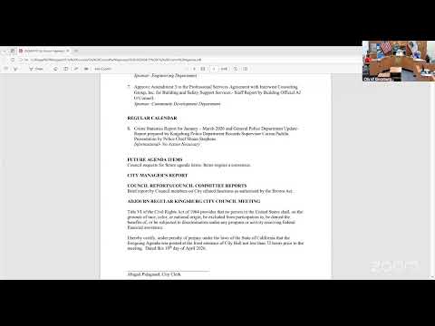 Police Chief Sean Stevens told the Kingsburg City Council that part 1 crimes were down about 13% for the first quarter but that two residential burglaries and related investigations remain active; Stevens said a person on the sex-offender registry placed at Crestwood was moved and the city will follow up with behavioral-health officials.