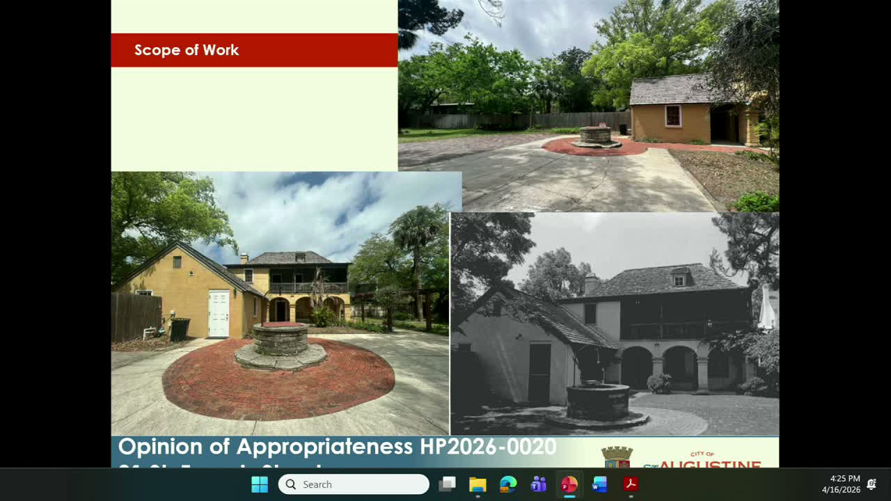 Megan Altus, director of the Saint Augustine Historical Society, and the design team said the plan is intended to restore historic garden character while increasing resilience to flooding and creating revenue‑generating event capacity to support long‑term maintenance. The board voted to approve an opinion of appropriateness with the noted comments and suggestions for the design team to implement in future permit drawings.