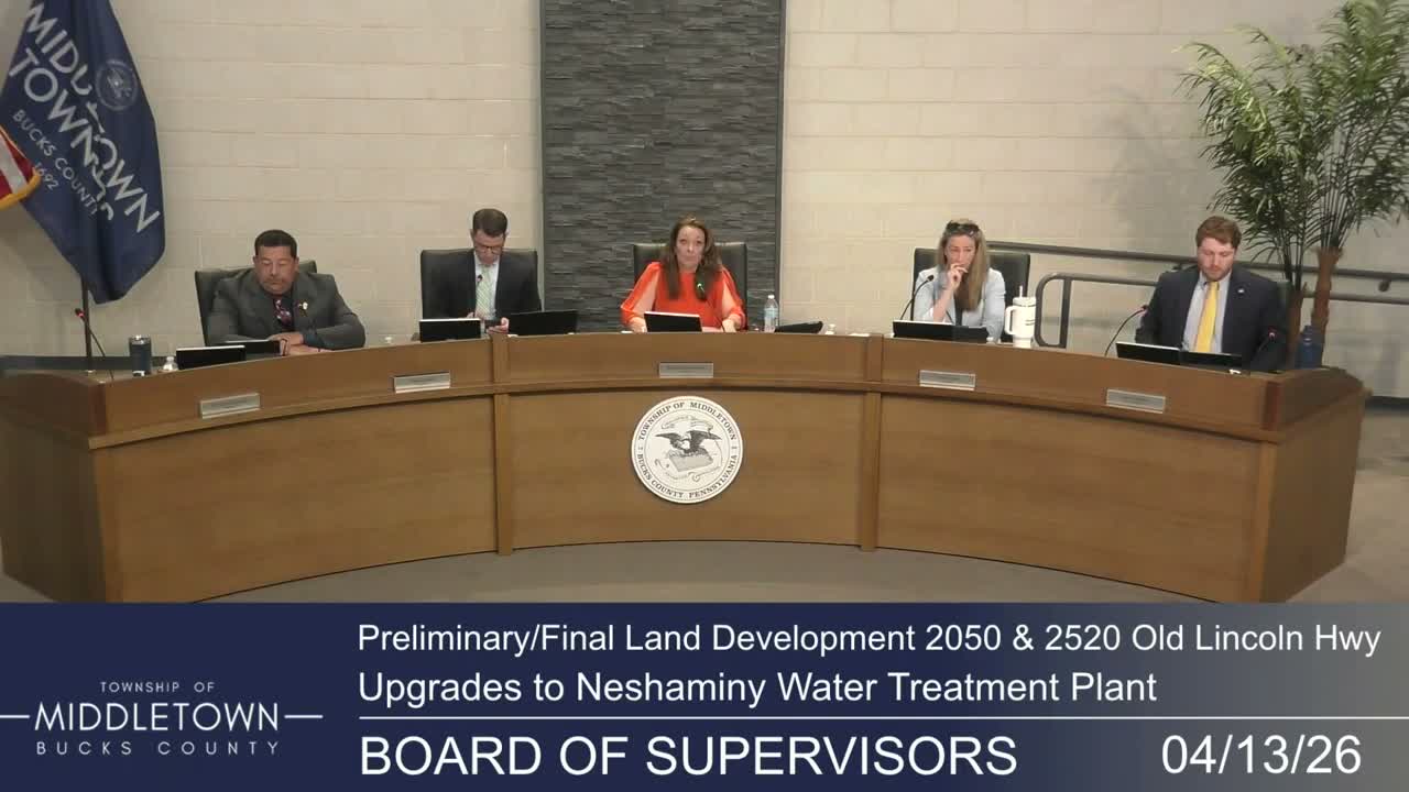 The Middletown Township Board of Supervisors unanimously approved preliminary and final land‑development plan approval for upgrades to the Neshaminy Water Treatment Plant at 2050 and 2520 Old Lincoln Highway, a project Aqua Pennsylvania said is intended to remove PFAS from the drinking water supply and meet forthcoming EPA regulations.