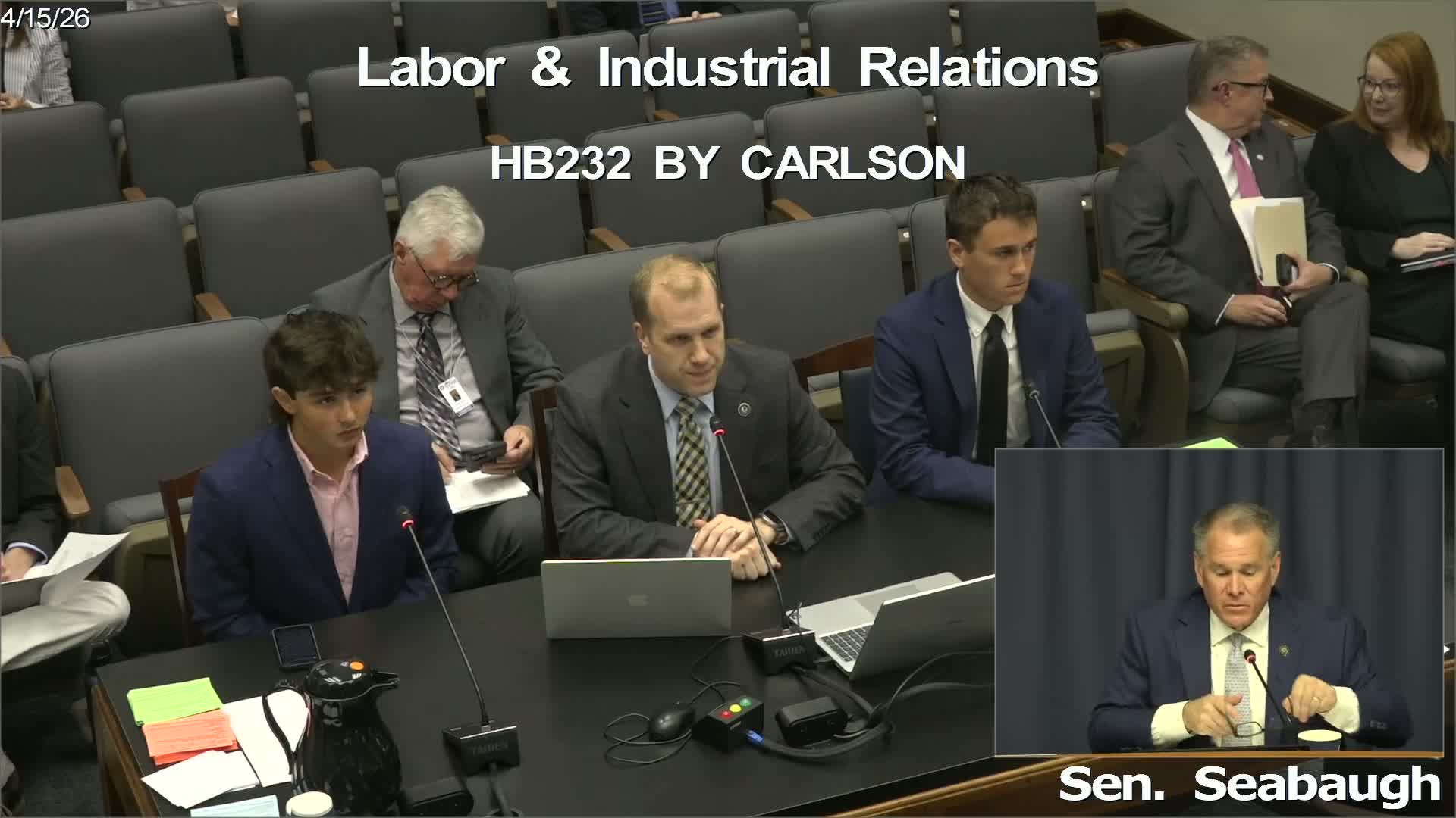 Representative Carlson told the committee HB 232 reduces an unnecessary burden on school systems by allowing a parent or guardian to sign an intent-to-employ form, rather than requiring school officials to act as intermediaries.