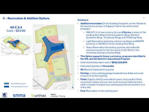The Committee member asked whether the layout would allow the district to avoid modular classrooms and keep career and technical education spaces on-site. The Presenter confirmed the C3.4 option “does offer that option certainly of building a new portion of the building,” noting it may provide more square footage outside the existing footprint and reduce the need to rely on off-site or modular classrooms.