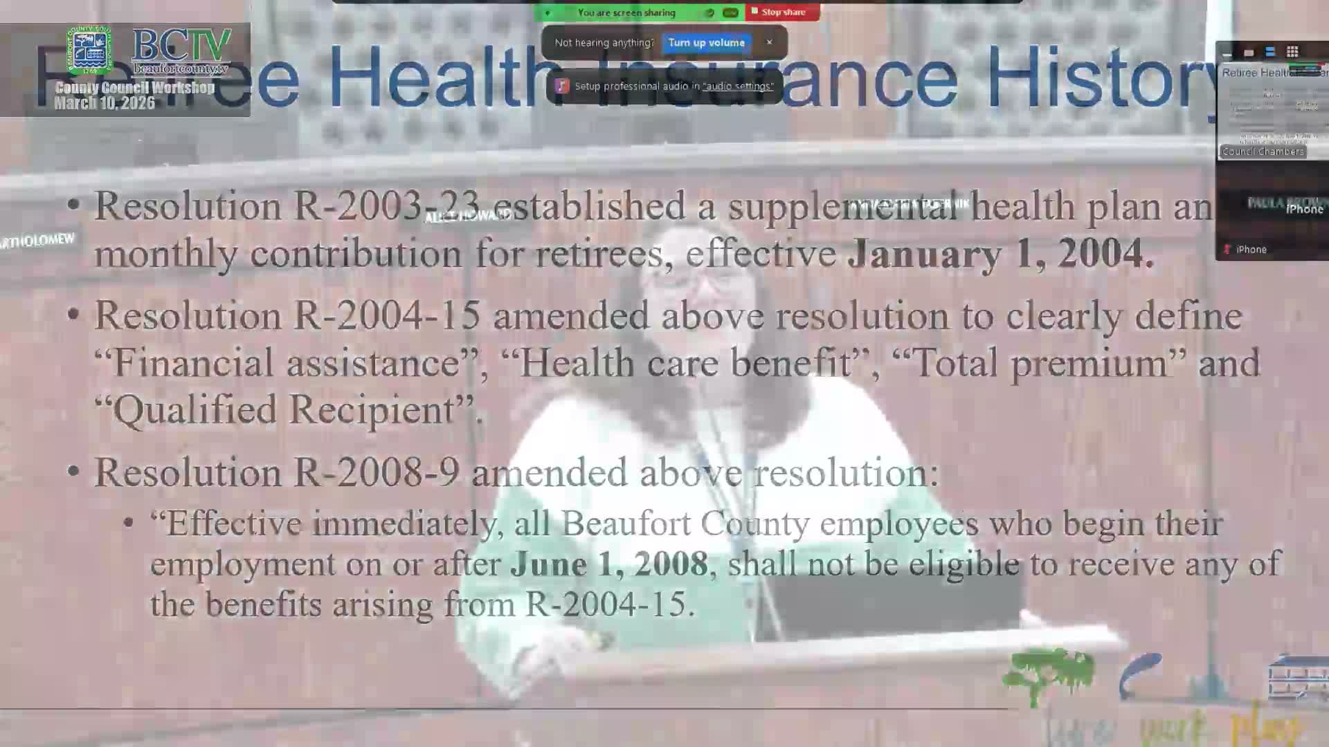 Beaufort County staff presented two linked proposals at the March 10 council workshop: a prospective Retiree Health Reimbursement Arrangement for pre‑Medicare retirees and a multi‑year plan to change employer/employee health‑premium contribution ratios.