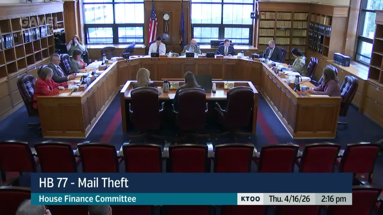 Sponsors and witnesses told the committee HB 77 would create a state mail‑theft offense (theft in the second degree, class C felony) to give local law enforcement charging tools; agencies submitted mostly $0 fiscal notes but described the potential caseload as indeterminate.
