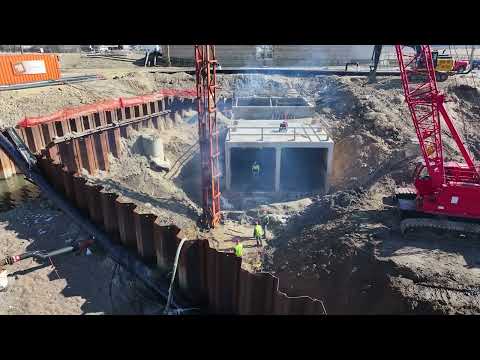 "There's 258 of them," the presenter said of the piles. After pile installation, crews will drill deeper, place reinforcement and fill with concrete to complete the foundation, the presenter said.