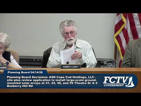 The Town of Falmouth Planning Board voted April 14 to approve ASD Cape Cod Holdings LLC’s application to install three large‑scale ground‑mounted solar photovoltaic arrays on properties off Theater Drive and Boxberry Hill Road.