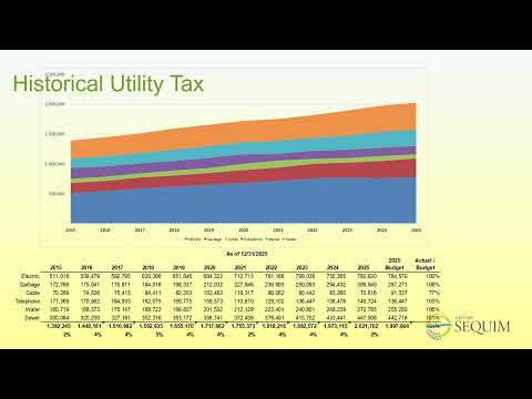 The presentation emphasized sales tax as the largest single general-fund tax source, with retail making up about 60% of sales-tax receipts; Hagener reported total sales-tax receipts of about $4.6 million for the year. She also said utility-tax collections were about $2.0 million and the certified property tax levy was $1,866,000 for 2025, rising to a projected $1,915,000 in 2026.