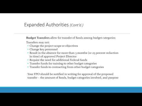 On budget transfers, Banks said grantees may move funds between budget categories when unforeseen circumstances arise (for example, delayed hiring), but transfers cannot change the project’s scope or objectives, cannot be used to change key personnel, and cannot be used to obtain additional federal funds. She noted training funds are generally not allowed to move to other categories and that a project director may not be absent for more than three months without approval.