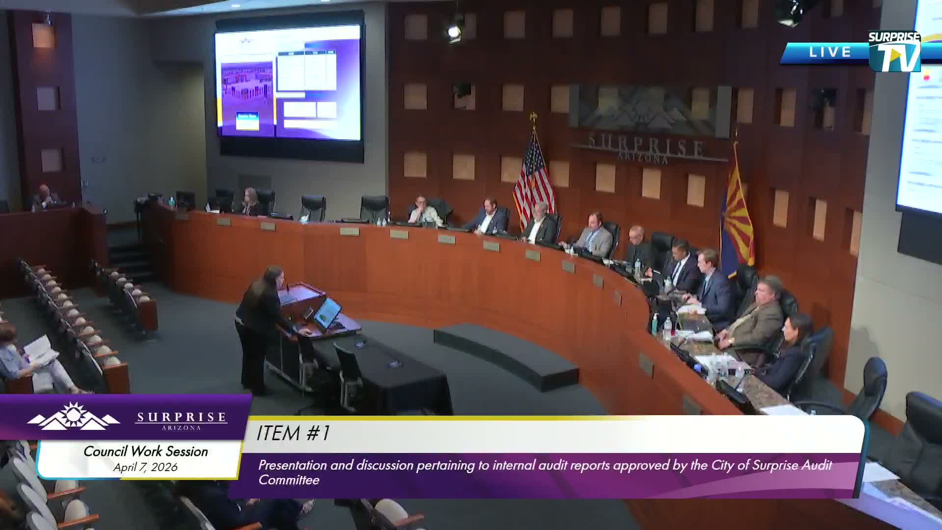 Central Arizona Project and local utilities briefed Surprise council on Colorado River shortage scenarios and Reclamation’s draft EIS; CAP urged Reclamation to reassess the DEIS and said the state would likely litigate if a compact call occurs. EPCOR and the city said current and committed customers are protected under their portfolios.