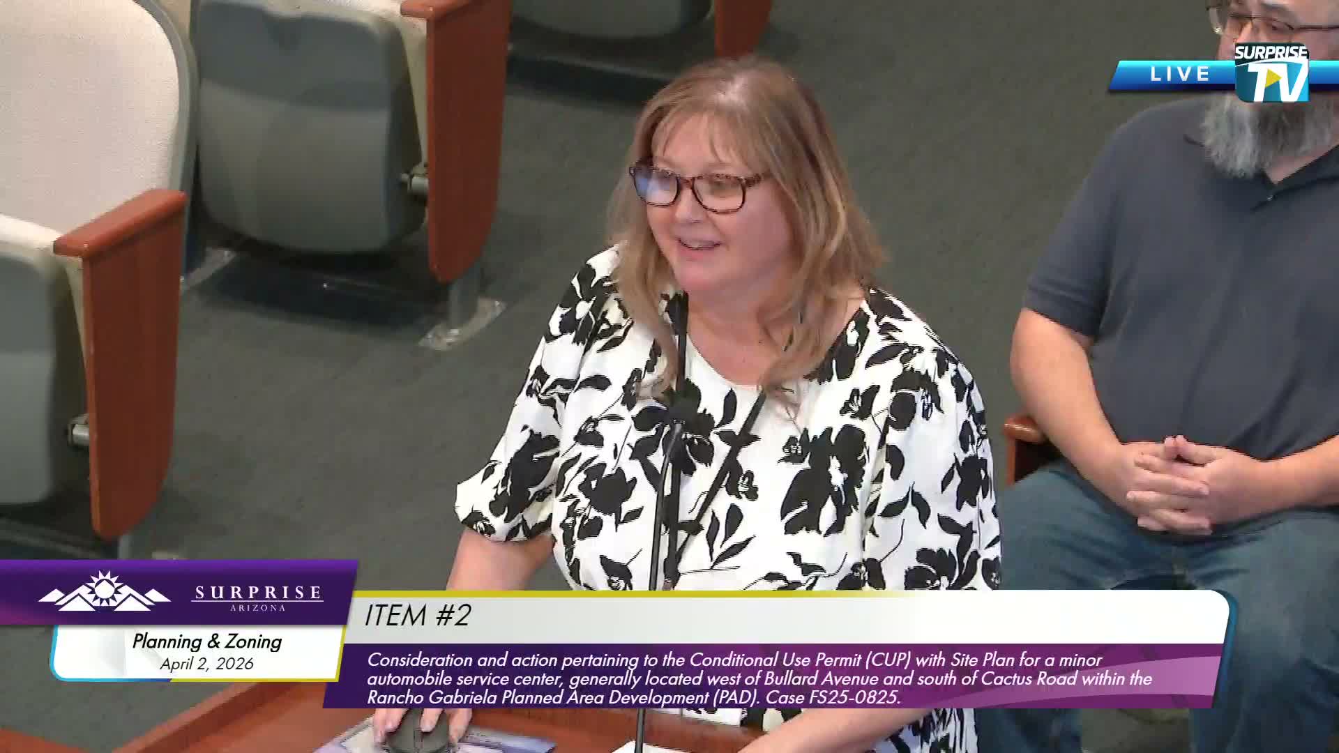 The Surprise Planning and Zoning Commission approved a conditional use permit for a 2,442 sq ft Grease Monkeys automotive service center at Bullard Avenue and Cactus Road (Case FS25-0825), after staff recommended approval and a resident raised noise concerns; the vote was 6–0.