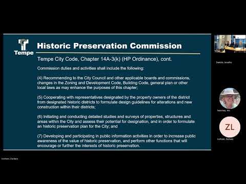 At a joint meeting, city staff reviewed the Historic Preservation Commission's advisory duties under City Code Chapter 14A and the Tempe Historic Preservation Foundation described ongoing projects including a POW barracks rehabilitation, Double Butte Cemetery work and a preservation bond.