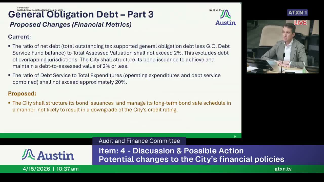 Ed Vannino, the city's chief financial officer, briefed the Audit and Finance Committee on proposed changes to the city's financial policies on April 15, recommending language that ties bond issuance practice to maintaining the city's credit rating rather than fixed numeric debt metrics.
