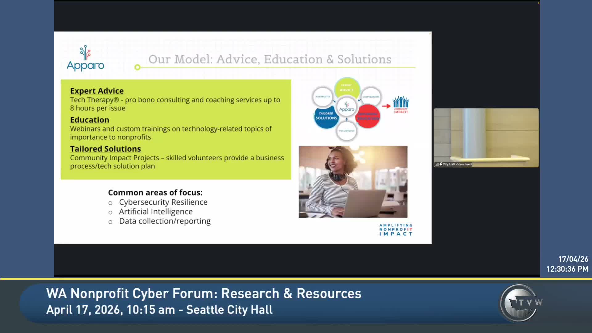 Jennifer Ray of APARO described a pro bono model that pairs corporate skilled volunteers with nonprofits for expert advice, training and tailored solutions—services APARO says return roughly $8.50 in value for every dollar invested. APARO’s "tech therapy" help line and customizable training aim to provide low-cost, nonprofit‑aware technical guidance.