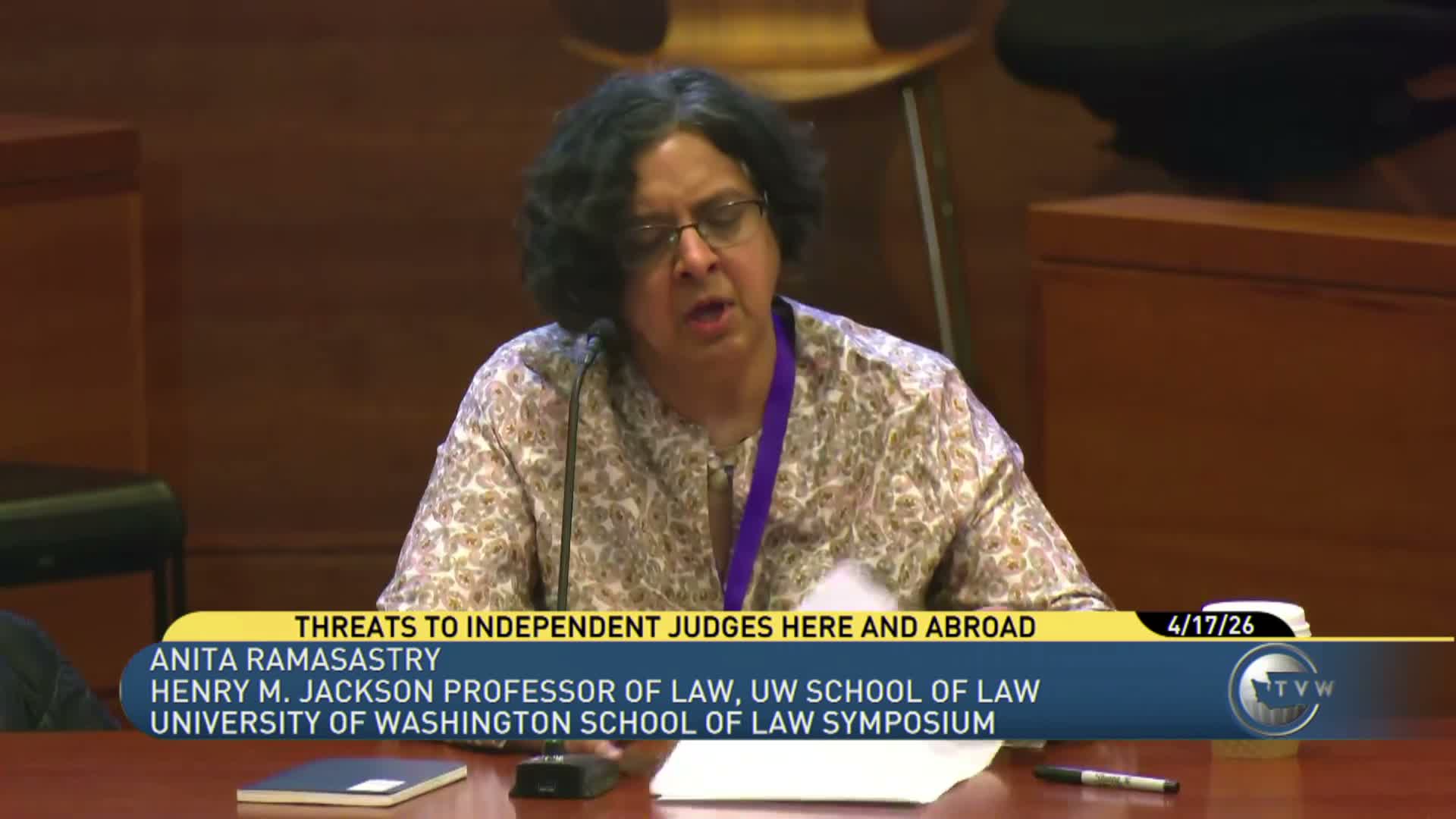 Anita Ramasastry, director of the Barer Institute for Leadership in Law and Global Development at the University of Washington, opened an afternoon panel on judicial independence that placed U.S. developments in a global context and invited data-driven and comparative responses.