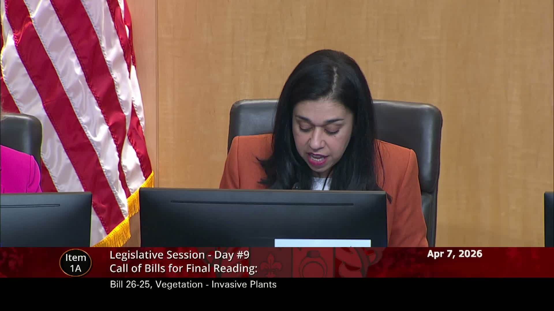 The Montgomery County Council unanimously approved amendments and final readings on multiple bills April 7, including an invasive-plants measure clarifying the county list and enforcement, removal of an annual OLO minimum-wage impact report, an agriculture exceptions clarification, and governance reforms for the Arts and Humanities Council.