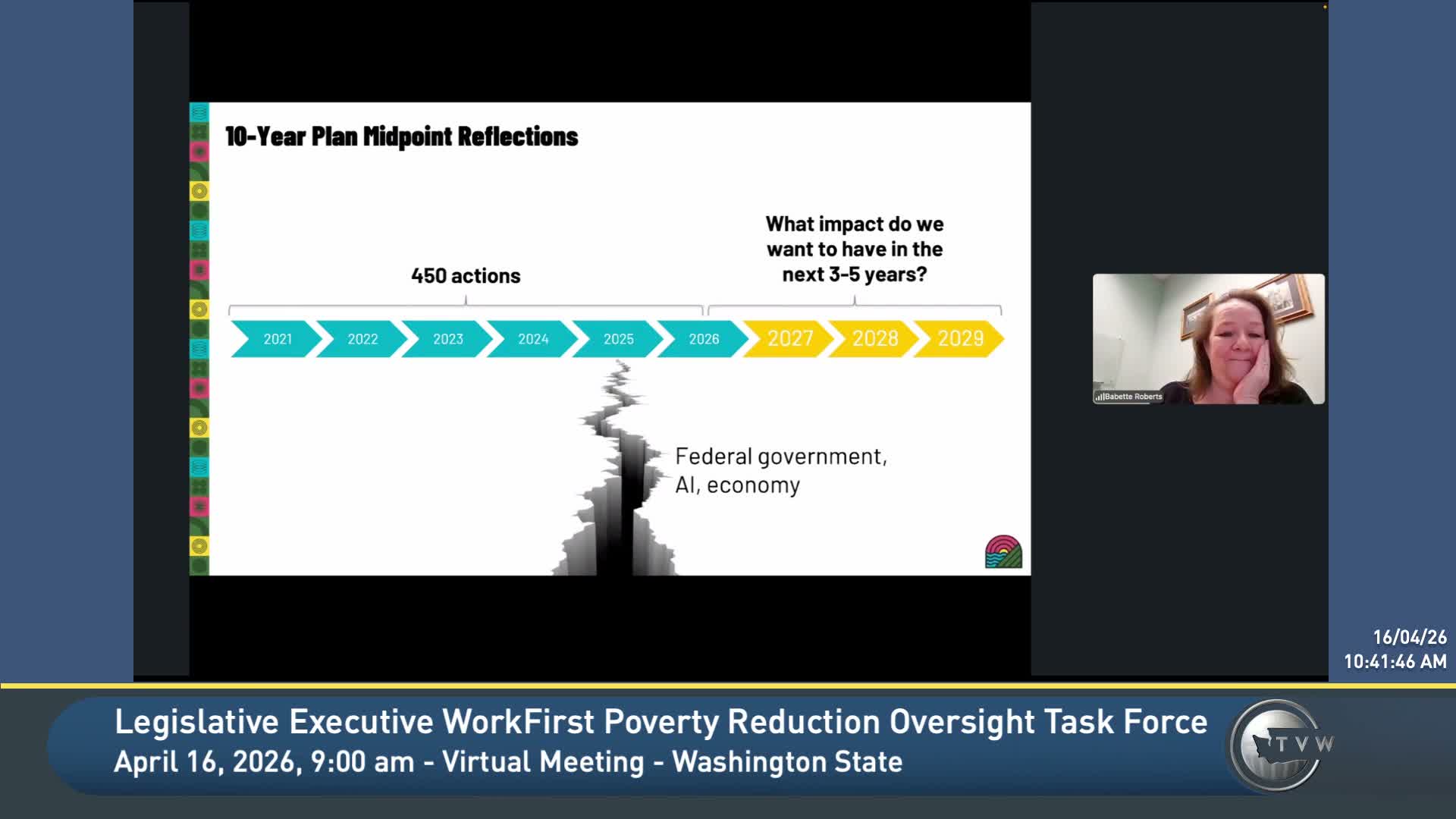 Laurie Finkst, executive director for the Economic Justice Alliance team at DSHS, briefed the task force on progress toward the Alliance’s 10‑year poverty‑reduction plan and next steps for a mid‑course refresh.