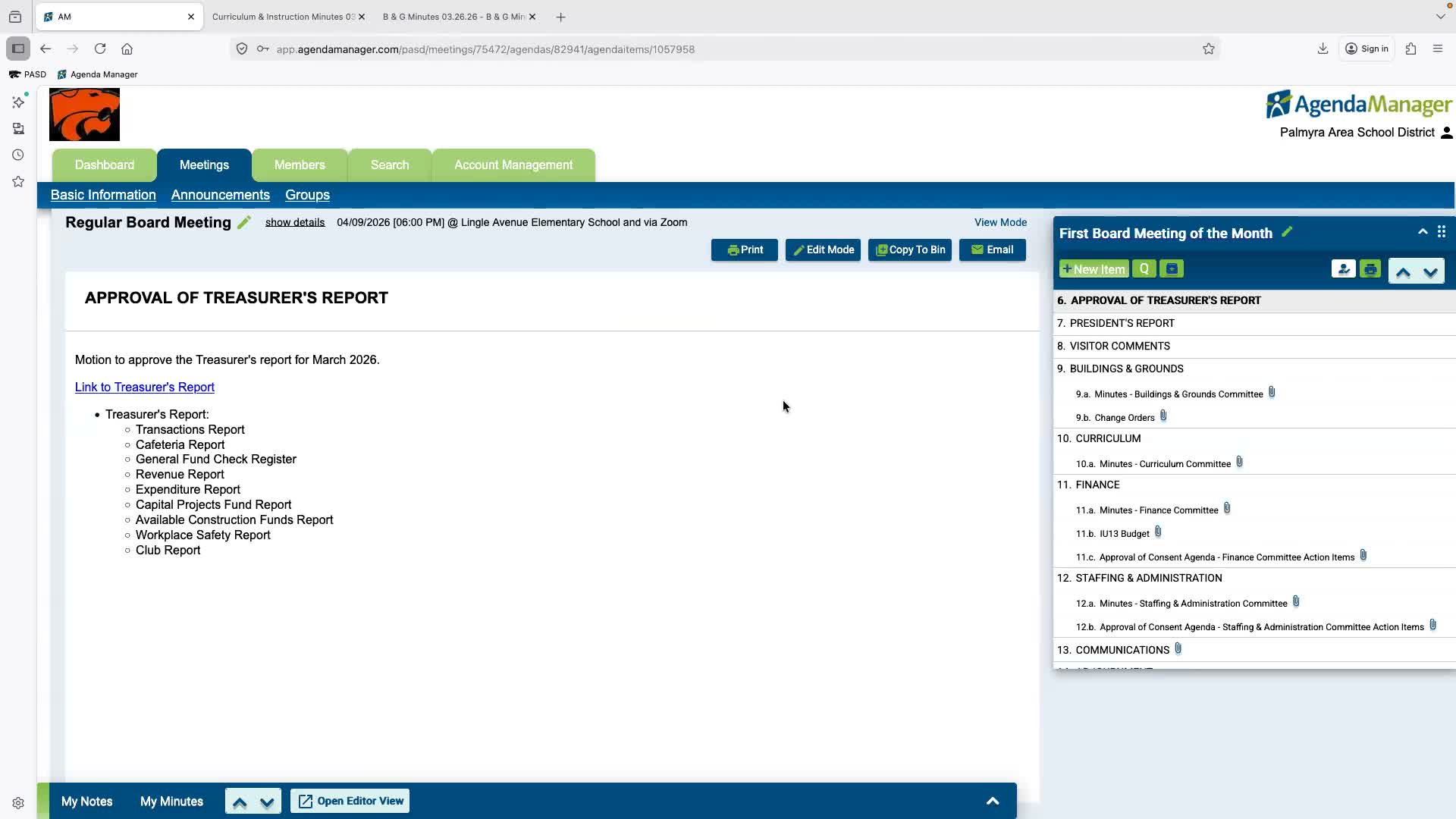 The Palmyra Area School District Board of Directors approved the treasurer’s report for March and several finance-committee items at its April 9, 2026 meeting.
