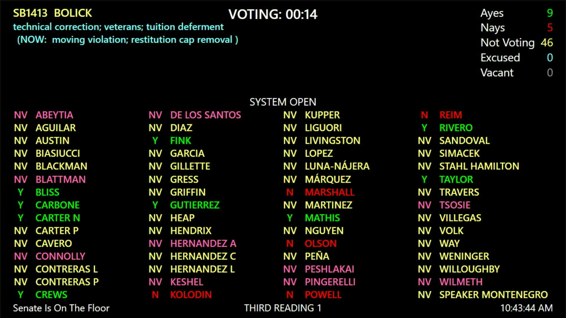 After explanations and recorded votes, the clerk announced the tally as 2 ayes, 48 nays, and 10 not voting; SB1413 failed. Later in the session Representative Martinez moved to have the House reconsider its action on SB1413 and to place the bill again on third reading, and that motion carried.