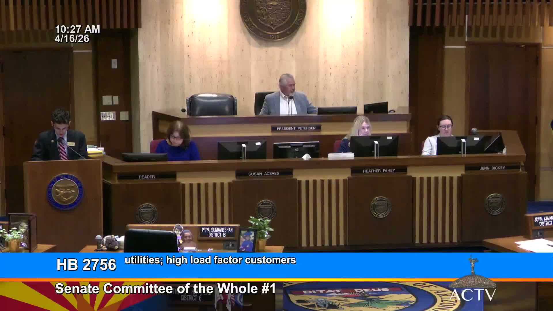 The Arizona Senate passed House Bill 27-56 after adopting floor amendments that alter reporting and planning language for utilities and large electric customers. The measure requires certain reports or notifications about extra-high-load customers and contains exemptions for smaller utilities.