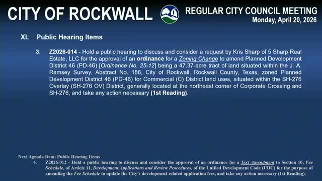 The Rockwall City Council on April 20 unanimously remanded a request to amend Planned Development District 46 that would add an outside‑storage allowance at 3301 Springer Road. Staff told council the property had multiple code enforcement citations and no completed application materials; the Planning & Zoning Commission had recommended denial 7–0.