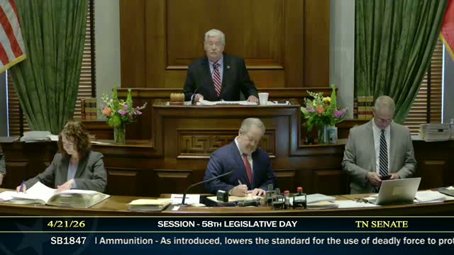 The Tennessee Senate on third reading approved Senate Bill 18-47, a measure that expands circumstances in which a person may use deadly force to protect property when they reasonably believe deadly force is immediately necessary to prevent specified offenses, including trespass, arson, burglary, theft, robbery and aggravated cruelty to animals.