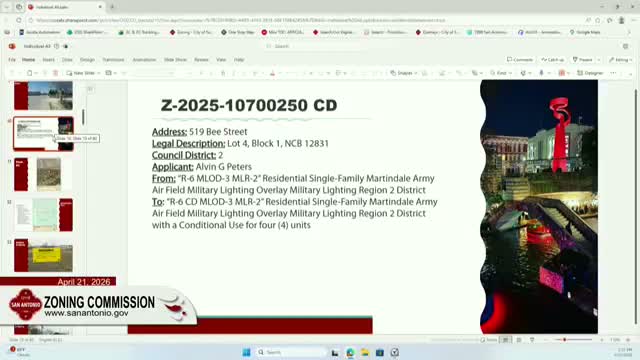 Commissioners asked about neighborhood outreach; Peters said he had walked the block and met with two residents and with at least one objector, and that he had adjusted the plan following those meetings. Commissioner Hinojosa moved for approval, Commissioner Pete Rodriguez seconded, and the commission approved the request on a roll call vote. The approval advances the matter to City Council for final action within the statutory six‑month period.