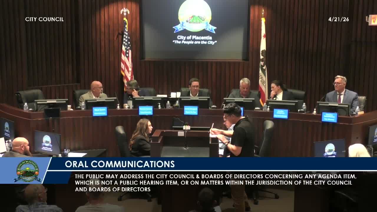 Members of the public urged Placentia City Council on April 21 to reconsider a proposed residential development at 777 Orangethorpe Avenue and to pull item 1g from the consent calendar over parking, land‑use and possible conflicts of interest. Craig Green and Jeff Buchanan said the parcel — the former Donneve Jeep dealership — is a scarce commercial asset better suited for revenue‑generating uses such as a hotel, and they warned a residential conversion would increase demand for police and fire services and reduce long‑term sales‑tax receipts.