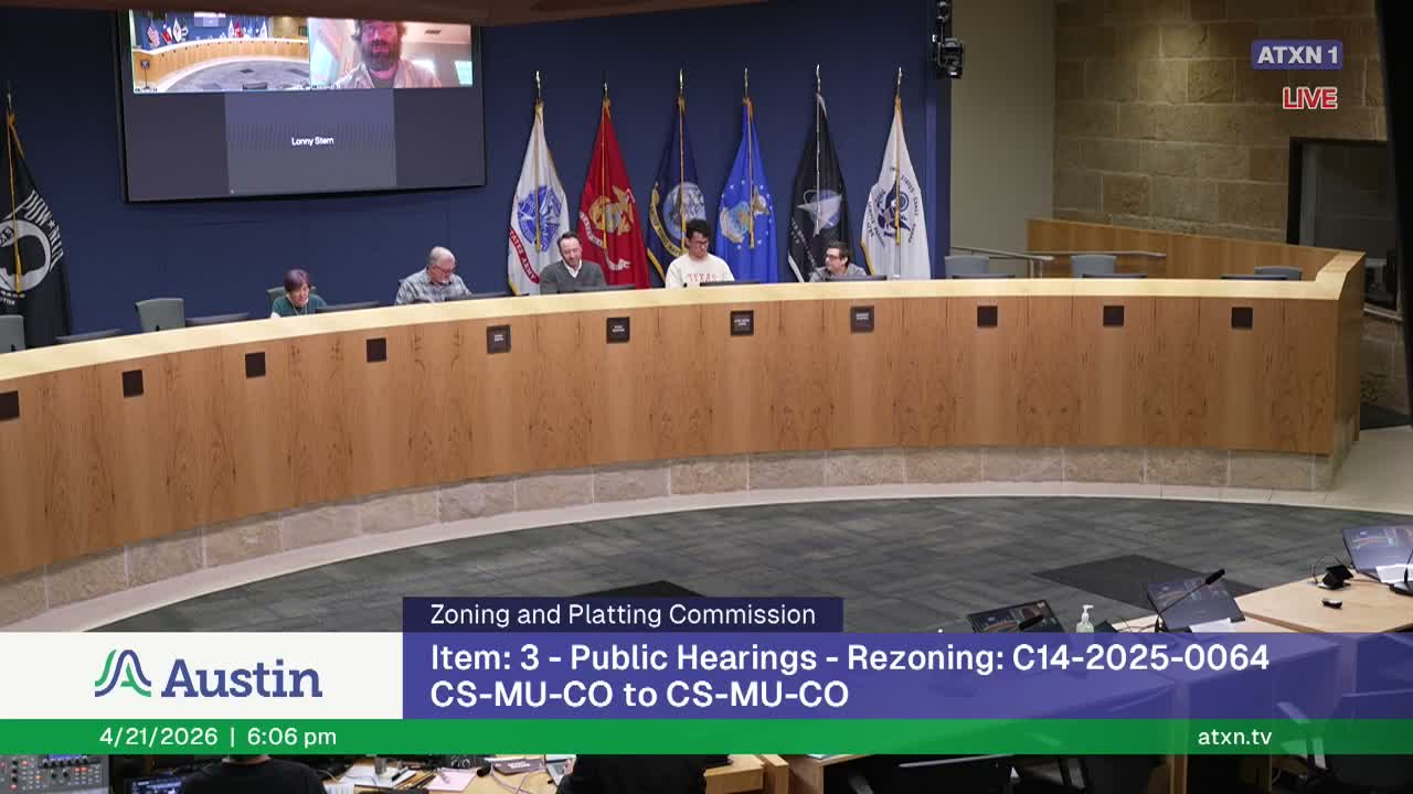 The Zoning and Planning Commission voted 6–1 on April 21 to recommend rezoning 8011 Bridal Lane from NO-MU-CO to LO-MU, endorsing staff’s recommendation to remove a legacy conditional overlay that limited the site to 300 vehicle trips per day.