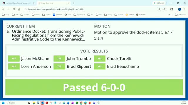 Housekeeping docket: Council adopted a four‑item ordinance docket moving selected provisions from the Kennewick Administrative Code into the Municipal Code (including city manager review timing, a surplus property policy, and Arts Commission provisions) and adjusted the Arts Commission membership to up to seven seats.