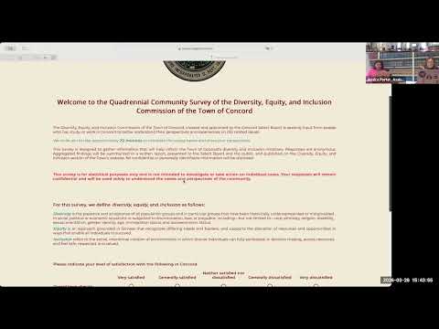 Commissioners heard that the survey's opening definitions for diversity and inclusion were updated to align with the commission's charge. The questionnaire includes three broad sections covering sense of belonging and experiences in town, questions about incidents of discrimination and harassment, and demographic items for cross‑tabulation; the draft adds Islamophobia, a "none of the above" option and an "other" write‑in where appropriate.
