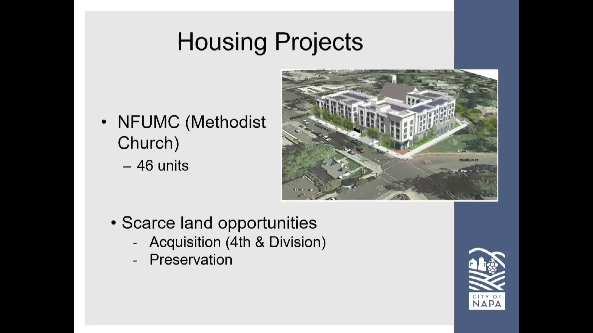 "There is 1 active affordable housing project in downtown, and that's NFUMC or Methodist Church as some people know it. That is a 46 unit fully deed restricted, which means fully affordable project," Goll said. She said the project was entitled under SB 4 (enabling housing on faith-based land) and remains in early development and funding stages.