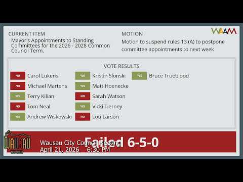 The Wausau Common Council approved confirmations of the mayor’s appointments to non-standing boards and commissions after suspending the rule that would have required their appointment tonight; the suspension carried on a recorded vote and confirmations were processed.