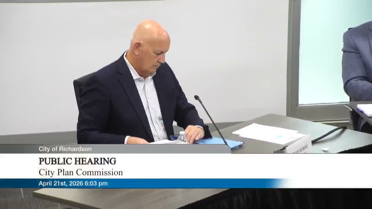The Richardson City Plan Commission on April 21 recommended approval of zoning file 26‑02 (Greenwood Park), a planned development to allow 40 detached houses on a 4.7‑acre site at 1111 West Shore Drive, after staff and the applicant described compact infill standards and neighbors raised concerns about parking, maneuverability and construction impacts.