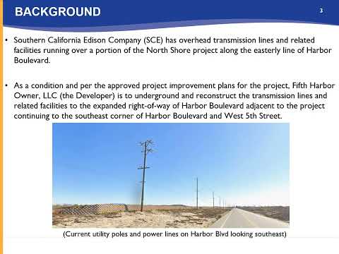 According to the presentation, SCE currently has overhead transmission lines running over part of the site along the eastern line of Harvard Boulevard. "As a condition of approval and per the approved project improvement plans, the Fifth Harbor owner, which is the developer, is to underground and reconstruct the transmission lines," Tai Chau said. The developer has obtained Edison approval in 2024 to relocate and underground the existing overhead lines and to place them behind the new roadway curb and gutter along Harbor Boulevard.