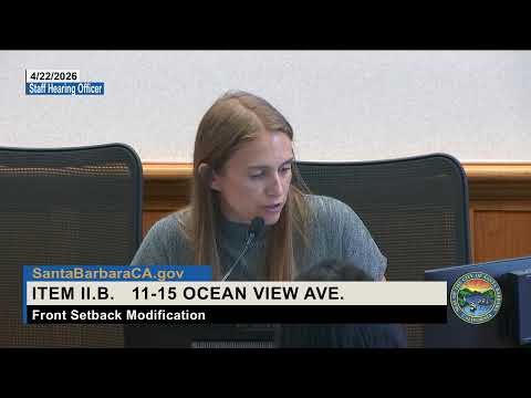 The staff hearing officer approved a front-setback modification to permit a single screened trash enclosure at the front lot line serving 11 and 15 Ocean View Avenue (Westmont College Ocean View Apartments), finding the work exempt under CEQA Section 15301 and conditioning recording of an off-site trash-easement; parking, screening and ABR review were discussed.