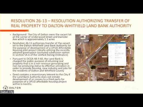 Finally, the council approved Resolution 26-13 authorizing transfer of an approximately 1.3-acre vacant tract at Underwood and Dantzler Streets to the Dalton Whitfield Land Bank Authority for a UPUD (unified planned unit development) affordable-housing pilot employing a "cottage court" or green-space courtyard subdivision approach. Staff said the deed will include a reversionary interest if the land bank does not initiate development within six months. Staff cited state law OCGA 48-40-60 as authorizing the land-bank action. The council approved the transfer.