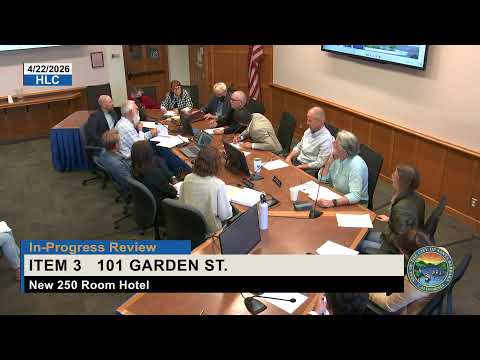 At its April 22 meeting the Santa Barbara Historic Landmarks Commission continued in‑progress review of a proposed 178,000‑square‑foot, 250‑room hotel at 101 Garden Street and requested additional design detail on colors, awnings, mechanical vent screening, the porte‑cochere and landscaping; commissioners unanimously voted to continue the item for an in‑progress review.