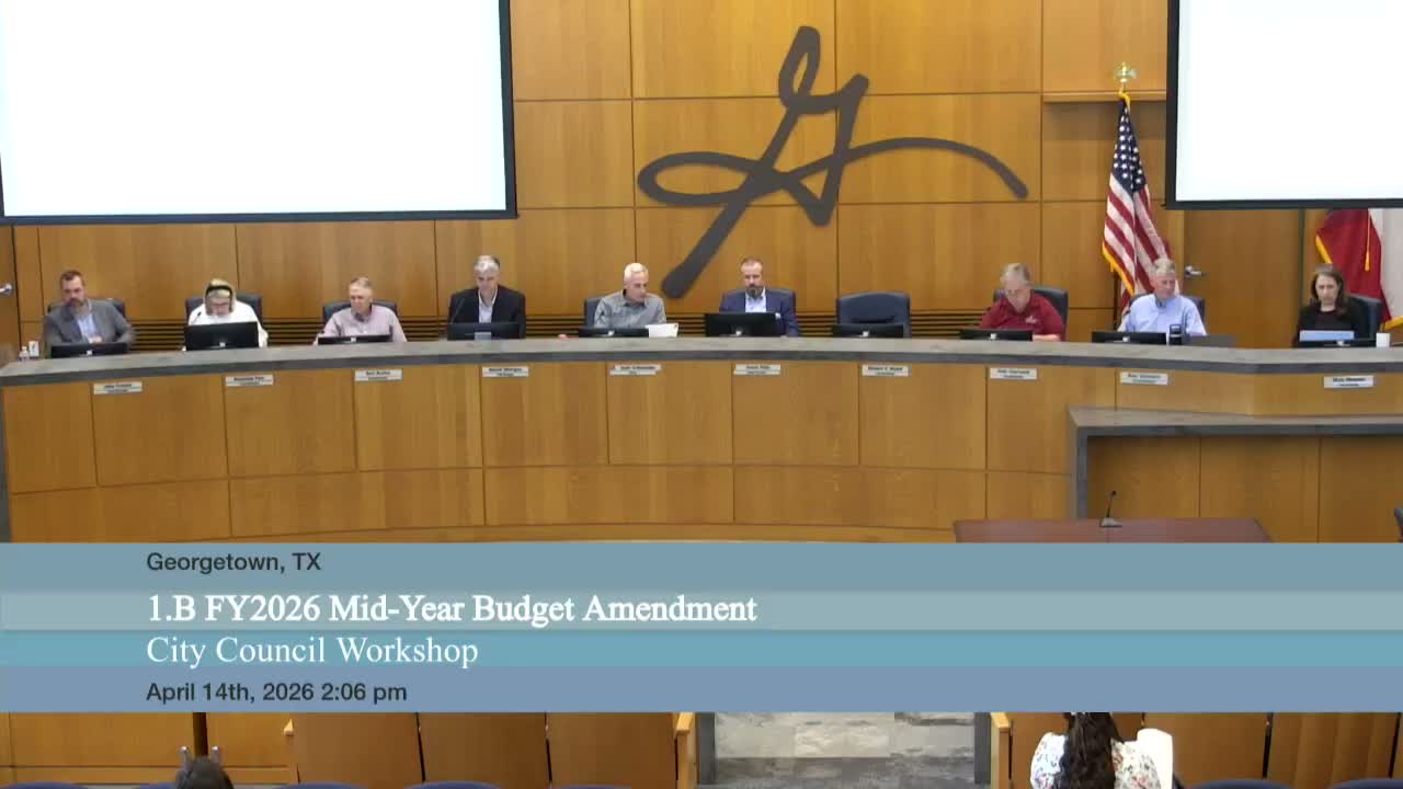 City staff presented the FY26 midyear budget amendment at a Georgetown City Council workshop, highlighting reallocated capital funds, fund closures and several one‑time transfers.