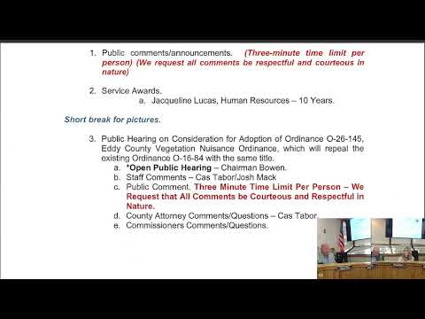 Road adoption (Resolution R-26-37): staff presented a pre-adoption report for several northern Eddy County roads (including Lehi at Richardson, East Wind west side additions, Dallas Avenue, Keith Avenue — with an easement commitment for construction — South Roselawn Avenue and South 2nd). The board voted to adopt the roads as presented; staff noted easements and construction commitments in at least one instance and said that one road’s construction would be funded by a private party willing to build a critical connector near a new fire station.
