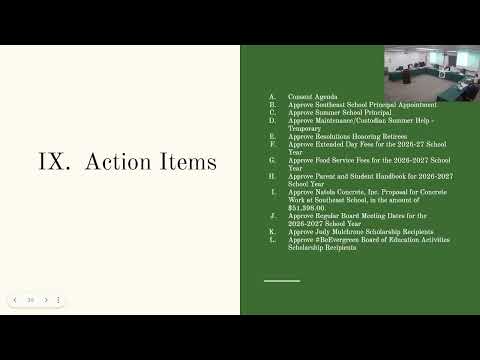 The Evergreen Park ESD 124 Board of Education moved through a slate of action items in open session and approved multiple routine and project items by roll call.