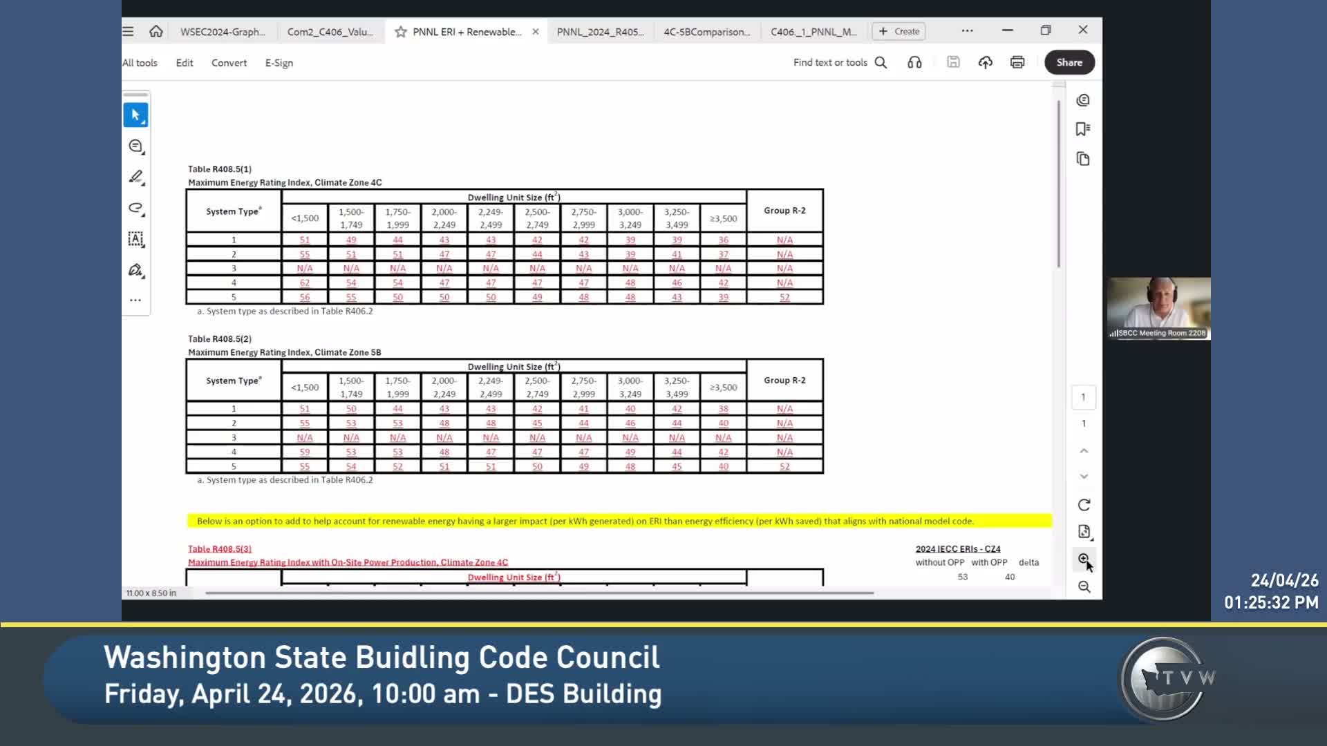 Staff explained that the ERI tables reconcile how on-site renewables are counted and that the top two r408 tables were ready to be included; stakeholders had suggested caps and thermal-envelope allowances to avoid over-favoring renewables in the performance path. The council also agreed to publish preliminary cost–benefit analyses with the proposed rules and directed staff to accept minor technical edits before the May filing date; staff set an internal deadline of May 1 for final edits before the May 6 code-reviser filing.