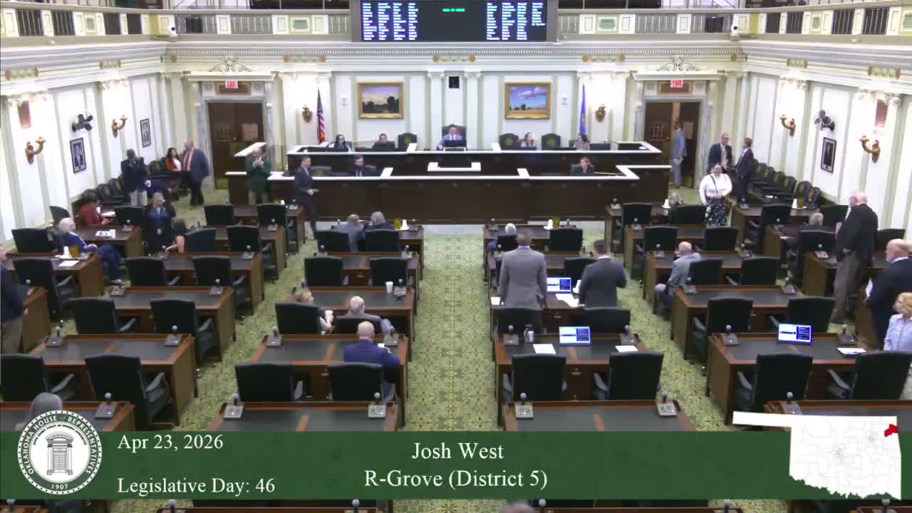 The Oklahoma House of Representatives convened April 23, 2026, and spent the morning on ceremonial business — including an invocation, a demonstration by the state auctioneer champion, recognitions for high‑school athletic teams and the introduction of the nurse of the day — before agreeing to adjourn until Monday, April 27 at 1:30 p.m.
