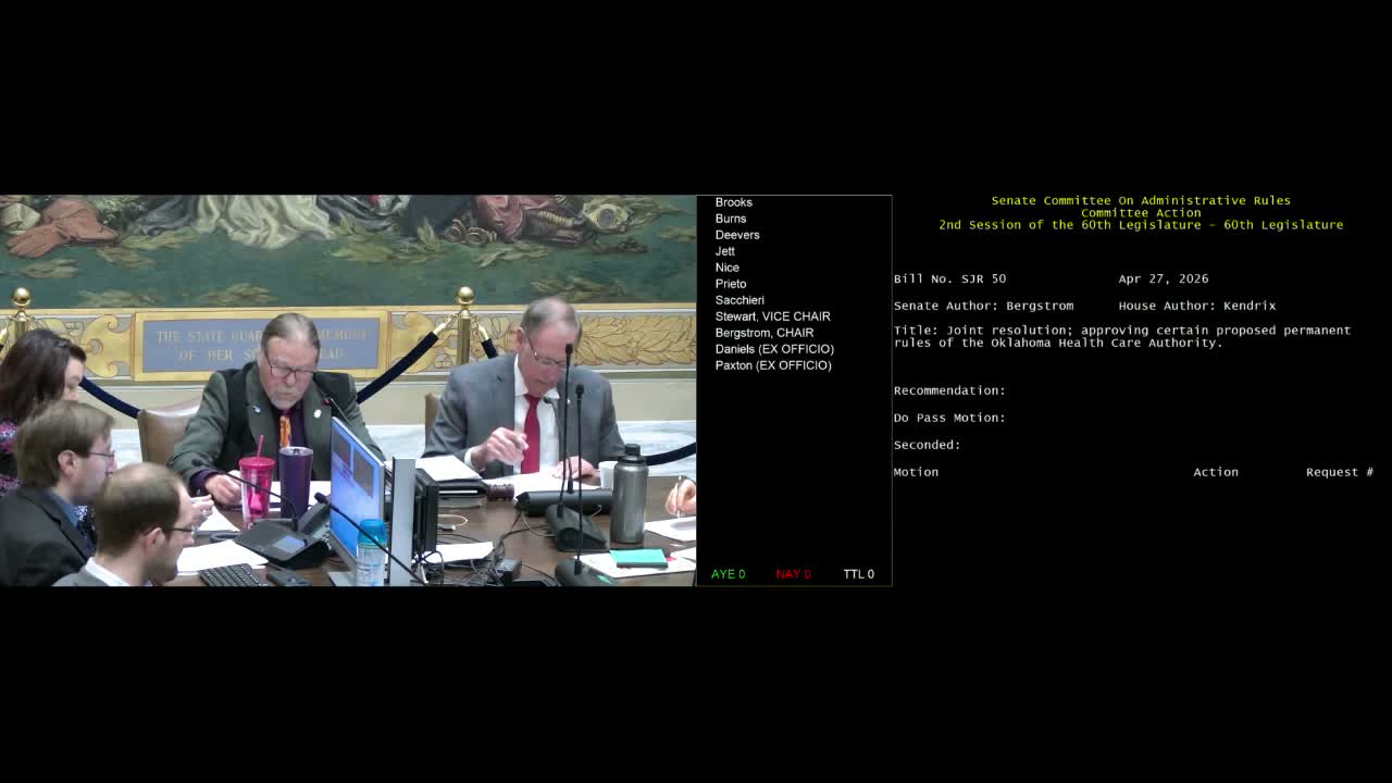 The Senate Committee on Administrative Rules voted to approve Senate Joint Resolution 50, adopting permanent rules in Title 317.3 to align Oklahoma Medicaid policy with a recent federal change.