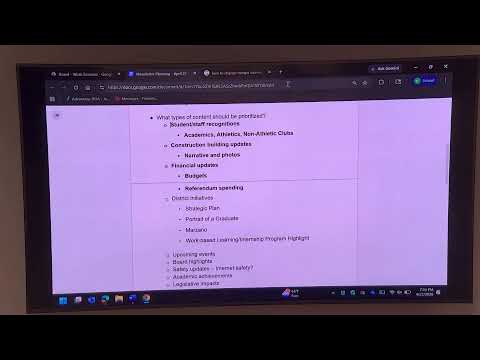 Board members discussed producing a mailed newsletter for all residents and businesses to summarize district finances, construction projects and student successes; members debated timing, format (print with QR codes), audience and cost, with a goal to mail by May or Memorial Day.