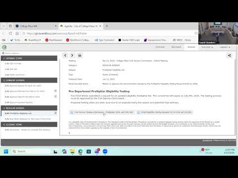 The College Place Civil Service Commission approved a consent agenda and voted to open the 2026 firefighter eligibility testing process during a brief virtual meeting called to order at 12:01 p.m. Thursday, April 23, 2026.