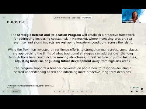 Workshop facilitators asked participants about preferred language for the program (responses included "strategic retreat," "community‑driven relocation" and "proactive relocation") and planned four small‑group breakout discussions on terminology, personal experience of coastal impacts, adaptation decisions/triggers and barriers/resources. The breakout rooms were not recorded; the facilitators invited continued participation at in‑person summer workshops and a fall virtual open house and asked attendees to fill out a survey at nantucket.gov.