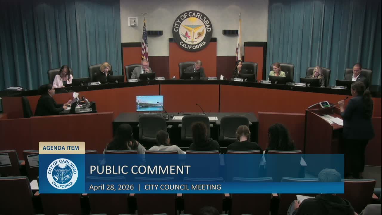 During public comment, residents described alleged assaults and police inaction, a student proposed a youth job portal for teens, and a high school athlete urged repairs and increased maintenance for Carlsbad State Beach restrooms.