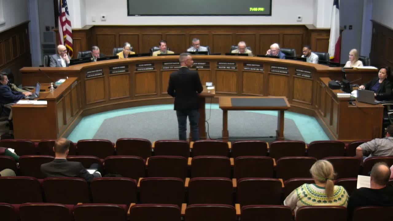 Council opened a public hearing on a proposed Caliber Collision repair shop and PD amendments at 2801 Main Street and 2700 Lake View Parkway, including requests for outdoor vehicle storage and reductions to setbacks and landscape buffers; council left the hearing open for action on April 7.