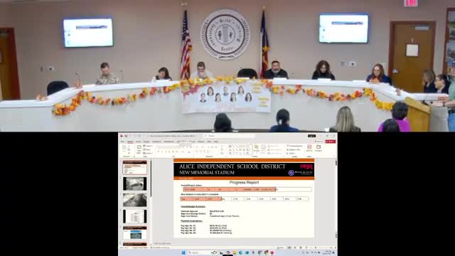 The Alice ISD Board on Oct. 13 received a construction progress update on the district’s new football stadium from Weber Jacobs and design partners, who reported major foundation and site utilities work is complete and said structural steel and other vertical work should appear on site by late October or early November.